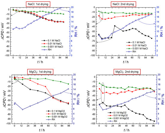 Based on the observation of negative peaks in CPD changes for each salt and salt concentration, the CPD minima were plotted against exposure time, indicating the RH in the SKP sample chamber for each SKP measurement. Throughout the first 96 h of the experiment, the RH was constantly rising in the SKP chamber, up to 20% RH. After this period, the samples were exposed to humid air (85% RH), leading to a rewetting of the droplets as the DRH of the salt solution was exceeded, followed by a second drying interval of 96 h in the SKP chamber. CPD minima versus time of both drying intervals are depicted in Figure 4.