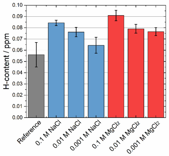 In general, MgCl2 was reported to be more corrosive than NaCl, which can be linked to the lower pH [52]. In order to clarify the impact of the cation and pH value of the applied salt solutions on the hydrogen insertion into the steel, another experiment was performed. For this purpose, CP1000 samples were immersed in 0.1 M NaCl and 0.05 M MgCl2 solution. Additionally, one set of samples was immersed into a 0.05 M MgCl2 solution, where the pH was increased by addition of Mg(OH)2 to match the pH of a 0.1 M NaCl solution (see Table 2). The resulting hydrogen content was measured with TDMS after 48 h immersion and is depicted in Figure 10. The hydrogen contents after immersion were generally higher compared to the values observed after atmospheric corrosion, keeping in mind that for this experiment, the entire sample was corroding. Based on the obtained results, the chloride concentration had a minor influence compared to the impact of pH: The average hydrogen content of the sample corroded in 0.05 M MgCl2 solution was still higher in average values compared to the sample, which was immersed in 0.1 M NaCl. For the samples immersed in 0.1 M NaCl, a larger spread in results was obtained as for those immersed in MgCl2 solution. Levelling the pH value led to a noticeable reduction in hydrogen content in the sample. However, it has to be considered that the parameters for this experiment were derived from the ones showed before, where single droplets were applied instead of immersion. This derivation in exposure conditions is, on the one hand, necessary to increase hydrogen contents, facilitating the study of the impact of single parameters such as chloride concentration and pH value. On the other hand, it is a strong simplification of the droplet experiment and will not reflect all features contributing to the (local) hydrogen entry. Regarding the overall results of this experiment, the differences in initial pH and chloride concentration of the salt solutions, together with the difference in ionic strength of the salt solutions, given by nature, seemed to have a minor impact compared to the difference in drying/wetting behavior that was partly caused by the different nature of corrosion products formed.