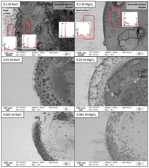The corroded samples were analyzed after SKP experiments with SEM and EDX (Figure 6). For almost all samples, a ring-shaped deposition of Fe corrosion products, rich in O and Cl, in the outer regions of the droplets could be observed, which formed during corrosion and evaporation of the salt solution. In the central part of the droplets, salt crystals of NaCl and MgCl2, respectively, were found, in larger quantity and size for the higher-concentration salt solutions. For 0.1 M MgCl2, the central droplet area seemed to be covered with a thick and dense crust of corrosion products and MgCl2, without the visible formation of a corrosion product ring. The appearance of the corroded surfaces matches previous findings for NaCl solutions where a stronger focus of anodic metal dissolution at the droplet edges was reported for 1 mM salt solutions [17].