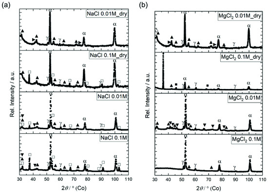 XRD results of corroded sample areas after application of (a) NaCl and (b) MgCl2 solution measured at low (5% RH = _dry) relative humidity over silica gel and at higher relative humidity (40% RH) in laboratory air (α = iron-bcc, γ = iron-fcc, □ = sodium chloride NaCl, ■ = brucite Mg(OH)2, ▲ = lepidocrocite γ-FeOOH, ▼ = akageneite (β-FeOOH), ◇ = ferric chloride FeCl3 ◆ = rokuehnite FeCl2·2H2O, ▶ = magnetite Fe3O4).