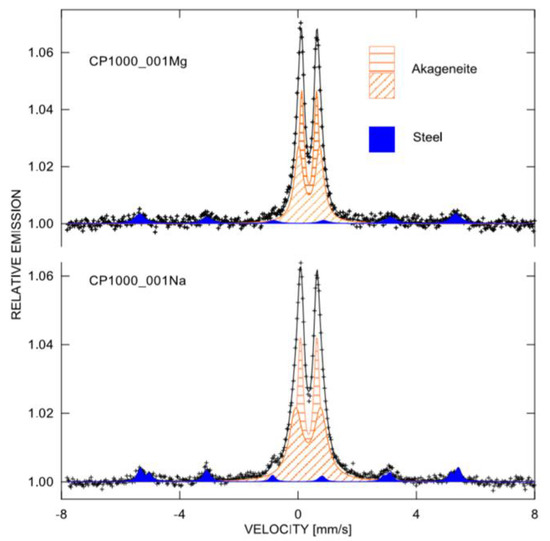 Finally, Mössbauer spectroscopy was performed on corroded samples with single droplets (150 µL) of 0.01 M NaCl solution and 0.01 M MgCl2 (Figure 8). The technique scans the sample at a depth of about 200 nm. The spectra were calibrated against pure alpha iron. Fitting of the experimental data was performed with a function consisting of sextets, which can be ascribed to the substrate steel, and two doublets, exhibiting isomer shifts of 0.367 mm/s and 0.352 mm/s and quadrupole splitting of 0.56 and 0.84 mm/s. According to these parameters, the doublets can be attributed to akageneite (β-FeOOH) with a high probability. The spectra obtained for both salt solutions showed large similarities, with slight differences between the relative intensities of the doublets, which can be explained by the variation in stoichiometry, differences in Fe-O distances, and presence of Cl− [41]. The observation of akaganeite by Mössbauer spectroscopy confirmed the results of the XRD analysis, where akaganeite was detected next to other corrosion products. The exclusive determination of akaganeite in the Mössbauer measurements can be a result of the scan depth of the method.