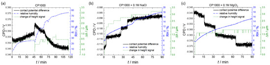 Evolution of CPD and change in height signal measured by SKP during increase in RH on (a) clean CP1000 surface, as well as CP1000 with addition of (b) 0.1 M NaCl and (c) 0.1 M MgCl2 solution.