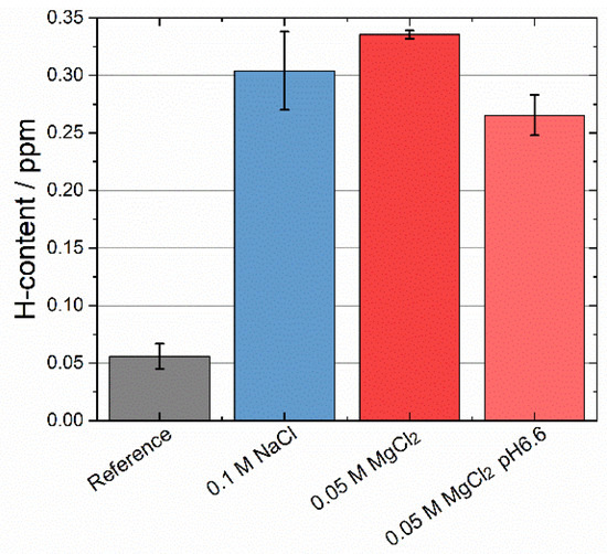 Hydrogen content determined with TDMS after immersion of CP1000 (70 mm × 20 mm) for 48 h in different electrolytes (50 mL) in comparison to non-corroded reference samples.