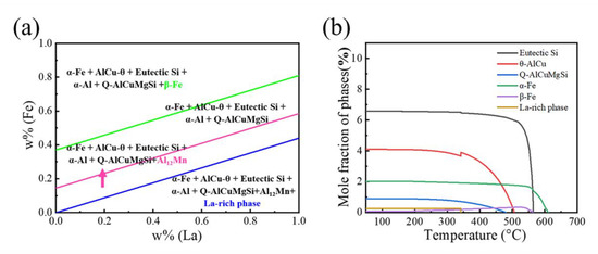 In addition, we calculated the equilibrium phase diagram of Al-7.3Si-3.5Cu-0.3Mg-0.4Fe-0.3Mn-0.03Ti-0.1La at room temperature that was used to guide the subsequent experiments and discussions. As shown in Figure 1b, the alloy system used mainly consists of eutectic Si, AlCu-θ(Al2Cu), Q-phase and two Fe-rich intermetallics, α-Fe(AlFeMnSi)and β-Fe(AlFeSi), where α-Fe accounts for about 2% (in molar %) of the alloy phase composition, while the total amount of β-Fe starts to precipitate at 570 °C, reaching up to about 0.2% then gradually decreases; the addition of La generates the RE-rich phase. As can be seen from the figure, the generation of the La-rich phase corresponds to the reduction of Al2Cu, which is an important strengthening phase, and it is reasonable to speculate that this phenomenon may be detrimental to the material strength.