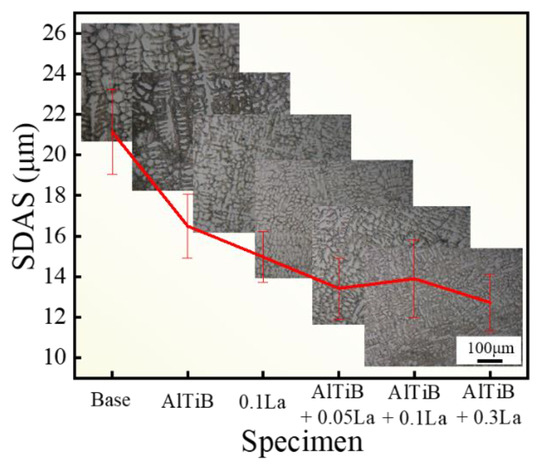 Figure 3 show the quantitative and statistical results of the microscopic morphology and SDAS of the six groups of samples. As shown in the figure, the SDAS of base was the largest with an average of 21.1 ± 2.2 μm, and the addition of 0.6 wt.% Al-Ti-B and 0.1 wt.% La significantly reduced the SDAS values with statistical results of 16.5 ± 1.6 μm and 15.0 ± 1.2 μm, respectively, which were 22.0% and 29.2% lower compared with base. The combination of La and Al-Ti-B brought more effective refinement, and the overall reduction of SDAS was positively correlated with the amount of La added. Among them, AlTiB + 0.3La had the smallest SDAS among the six alloy samples with a value of 12.7 ± 1.4 μm, which is 39.8% lower than that of base.