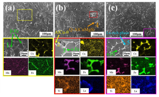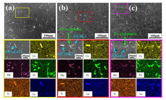 The samples after heat treatment were examined by SEM/EDS. After the solid solution treatment, the low melting point eutectic phase (Al2Cu, Q phase) dissolved into the matrix, while the Fe-rich phase was retained due to its higher melting point; therefore, theoretically, all the phases in the alloy were Fe-rich and no Cu-containing intermetallic compounds. However, the results show that there was still a relatively obvious enrichment of the Cu elements, and the distribution remained highly consistent with that of La elements and some Ti elements, as shown in Figure 8. In addition, the number of RE-rich phases increased significantly with the increase of La addition. These RE-rich phases were mainly Al-Cu-La-Ti and Al-Cu-La, which were needle-like and short rod-like in morphology, similar to the β-Fe morphology mentioned previously. This phenomenon was particularly evident in AlTiB + 0.3La, in which a large number of fine La-rich phases were distributed in aggregation with the Fe-rich phase, making it difficult to distinguish between the two.