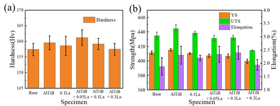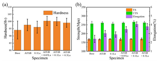 The results of the hardness and tensile properties tests of the six groups of samples in the as-cast state are shown in Figure 6. As shown in Figure 6a, base had the lowest hardness of 95.6 ± 3.8 HV; both Al-Ti-B and 0.1La added alone improved the hardness value, reaching 97.6 ± 3.0 HV and 96.1 ± 3.2 HV, respectively. Similar to the microstructure size characterization, the combined addition of the two also showed better results in hardness than adding them alone. However, unlike the previous description, the performance of AlTiB + 0.3La was not the best.