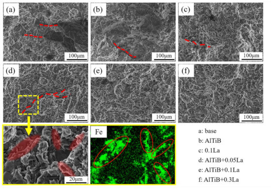 As shown in Figure 7, the as-cast fracture morphology of six alloys was composed of dimples, tearing ridges and a small number of cleavage planes. Specifically, the dimples of base were coarse and irregular, and large-sized holes accompanied by two obvious microcracks were found. AlTiB and 0.1La had significantly reduced micropores, and their dimples were more homogeneous than those of base, but at the same time, significant cleavage planes were found in the above two groups of samples. The last three groups of alloys exhibit good plasticity due to their fine microstructure and less β-Fe. They have small uniform dimples, which are ductile fractures. In addition, it is well known that the fracture of Al-Si alloys tends to start from the hard and brittle second phase, such as the Fe-rich phase and coarse eutectic Si, due to the development of internal stresses during plastic deformation. Taking the fracture of AlTiB + 0.05La as an example, one of the microcracks was observed, and its region was examined by EDS. The crack extension path was found to be very consistent with the distribution of Fe elements, so we concluded that the Fe-rich phase was one of the main causes of fracture.