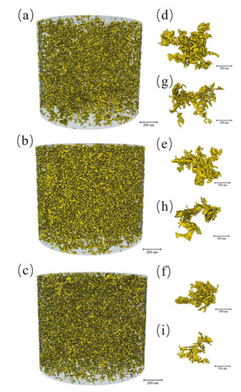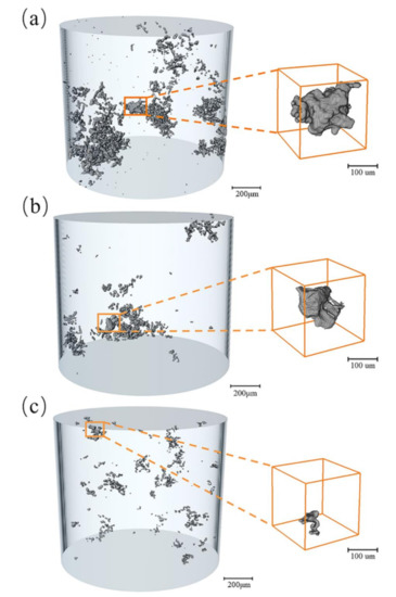 The tomogram was obtained by X-ray tomography and imported into 3D visualization software for 3D reconstruction after the correction of artifacts, filtering and noise reduction. As the density and the atomic number increased, the absorption of X-rays by the material was enhanced, and the area on the tomogram was brighter, i.e., the gray value was greater. In this experiment, the regions with larger and brighter grayscale values were the intermetallic compounds: the two Fe-rich phases and La-rich phases, while the black regions were the micropores. Since the grayness of the Fe-rich phases and La-rich phases were similar, there was no good way to separate them, so only the intermetallic compounds and pores could be separated from the Al matrix.