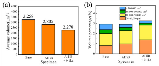 It is difficult to derive the exact variation pattern from Figure 9a–c only, so further quantitative statistics were performed on the 3D data, and the results are shown in Figure 10. Among them, Figure 10a show the average volume of particles, and it can be seen that base size is the largest, and both the refiner Al-Ti-B and La can significantly limit the intermetallic compound size; while AlTiB + 0.1La has the largest total volume of the intermetallic compound, and the percentage of large volume particles (>100,000 μm3) is the smallest among the three groups of alloys. Combined with the 2D statistical results, we can reasonably speculate that La can crush large-sized Fe-rich phases in addition to its role in converting β-Fe into α-Fe. In addition, the depletion of Cu and Al by La elements formed La-rich phases, which also directly led to an increase in the total volume. In contrast, the addition of Al-Ti-B only limited the growth of large-size particles and had no effect on the total volume of the intermetallic compound.