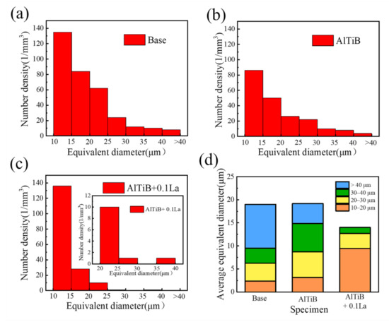 Figure 12a–c show the statistical distribution of the equivalent diameter of the micropores; Figure 12d show the average equivalent diameter and the ratio of different size micropores to the total volume. As can be seen from Figure 12, base and AlTiB have almost equal average micropore sizes, while base is larger in terms of the number of large-size micropores and the total number of micropores. The addition of 0.1La changed the interval of microporous size concentration, resulting in most of the microporous sizes less than 15μm. There were few large-sized micropores, with only two pores with an average equivalent diameter greater than 25 μm and none greater than 40 μm. The average equivalent diameter of AlTiB + 0.1La was 13.6μm, compared with 19.2μm and 19.3μm of base and AlTiB, which was reduced by about 30.0%.