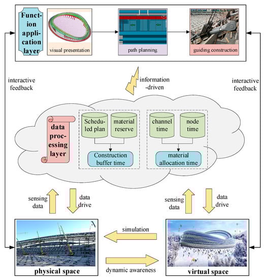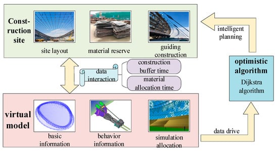 In the physical space, by capturing the schedule, material reserve and field distribution of each node in the field construction, it provides real working condition support for the simulation in the virtual space. In the virtual space, the site layout model of the construction site is established to truly map the working conditions and layout of the site. At the same time, construction behavior roaming is carried out in the virtual model to simulate the allocation of materials on the site. Additionally, the condition of the site is simulated from the construction state, thus realizing the interactive mapping between the virtual space and the physical space. In the data processing layer—driven by an intelligent algorithm—the buffer time of each construction position (the time when materials can support construction), the time spent on allocating materials in each path, and the feasibility of allocating paths are analyzed. Finally, the visual presentation of the construction site and the planning of the material-allocation path are carried out in the functional application layer, so as to guide the on-site construction. At the same time, the data-driven function is realized through the information extraction of the scene and the simulation analysis of the virtual model. The functional service layer interacts with the virtual and real space, thus connecting the various dimensions of the framework.