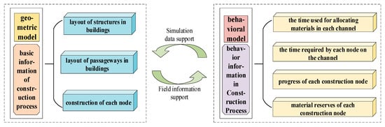 In the process of establishing the virtual model, firstly, the basic information on the construction site structure layout, channel layout, and the construction of each node on the channel are modeled at the geometric level. The geometric model is established using a BIM modeling software such as Revit. By establishing a geometric model with high fidelity, the geometric characteristics of the construction process can be truly mapped. Additionally, the actual working conditions of the construction site can be intuitively displayed, which provides field information support for the analysis of the subsequent behavior model []. The geometric model can also intuitively show the allocation path after intelligent planning. In the behavior model, combined with the basic information of the scene provided by the geometric model, the time required for the allocation of materials in each channel and the time required for each node in the channel can be analyzed by roaming. In the behavior model, the relationship between the progress of each construction node and the material reserve can also be calculated through the construction simulation. Moreover, the buffer time of construction can be calculated, which provides constraints for the planning of material allocation time and path. The behavior information of the construction process is identified in the geometric model, and the construction of the behavior model provides simulation data support for the path planning in the geometric model. The information dynamic simulation in the virtual model is shown in Figure 3.