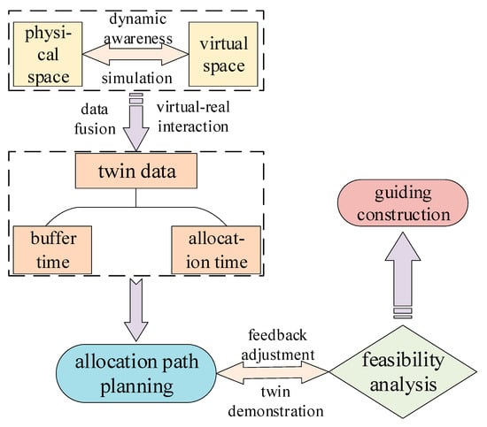 According to the intelligent planning method of a material-allocation path driven by DTs, it is necessary to collect the physical information on site in real time, and carry out the dynamic simulation of site construction in the virtual model. Thus, the interactive mapping between virtual space and physical space is achieved. The virtual–real interaction model for intelligent path planning is built to support the data processing of the Dijkstra algorithm.