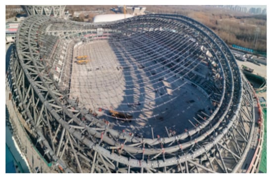 With a total construction area of 97,000 square meters, the National Speed Skating Pavilion, is located on the west side of Beijing Chaoyang District Olympic Forest Park and to the south side of the National Tennis Center Diamond Stadium. During the 2022 Beijing Winter Olympics, the National Speed Skating Pavilion will undertake speed skating competitions and training. The main structure of the speed skating hall is a cast-in-situ reinforced concrete structure, and the roof is a large-span saddle-shaped cable network structure. The structural span is 124 m × 198 m, supported by the outer steel ring truss, and the curtain wall cable is set outside the ring truss. The steel ring truss adopts the structural form of a three-dimensional truss, and the grid spacing is 4 m. The maximum specification of the chord in the truss is P1600 mm × 60 mm, and the joints are connected in the form of coherent welding. The ring truss and steel-reinforced concrete column are connected by finished spherical hinge support. The external curtain wall support structure adopts a steel cable and vertical wave steel keel. The construction site of the speed skating rink is shown in Figure 6.