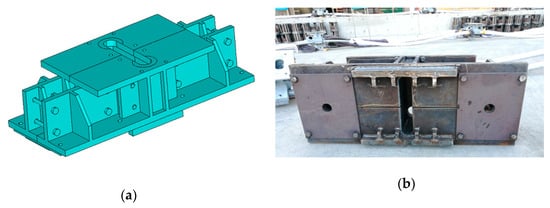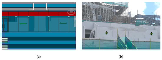 In the construction of the structure, because it is difficult for a tower crane to transport material to the connection part of the roof and the lower structure, the process often needs manual participation []. In order to improve the efficiency and intelligence, the construction progress and material reserves of important nodes are accurately controlled. In order to improve the accuracy of material allocation, the materials required by each node are collected on the spot and virtually modeled. The real-time interaction is carried out by the sensor equipment. The virtual–real interaction of materials is shown in Figure 7. The basic information such as the type of material, and the behavior information such as the construction position, are determined by the virtual model. The RFID tags are arranged in the real components to read the information in real time, and the management mode of ‘one thing and one code’ is realized.