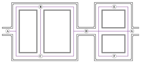 The layout diagram of the construction process analyzed in this study is shown in Figure 8, in which materials are stored at node A, and there is a shortage of materials at nodes D, E, and G. The nodes (A, B, C, D, E, F, G) in the figure represent the positions where the material passes. According to the construction schedule plan, material reserves and field distribution, the construction buffer time of each node is calculated in physical space and virtual space, respectively. Finally, the buffer time and allocation time of each node are fused using the entropy method; thus twin data are formed, which can effectively reduce the error caused by the inaccuracy of field information collection and virtual space simulation, and provide data support for the intelligent planning of the material-allocation path. The twin data of the buffer time and allocation time of each node are shown in Table 1. In the table, a single node indicates that there is a nesting phenomenon of the node, and analyzes its construction buffer time. The nodes are connected to represent the allocation path of the material, and the time includes the time passing through the starting node. Therefore, on the same path, different starting nodes will lead to different allocation times.