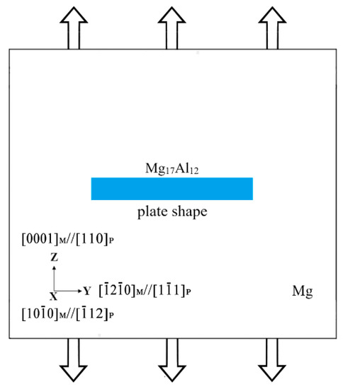 Figure 1 shows the initial configuration of the single-crystal magnesium with a single plate-shaped precipitate Mg17Al12 lying on the basal plane [25,26]. The lattice constant of magnesium is a = 0.32 nm and c = 0.52 nm. The X, Y, and Z axes of the matrix are along the crystal directions [100], [20], and [0001], respectively. The periodic boundary condition is applied along the X, Y, and Z directions. The precipitate Mg17Al12 [27] with [11] a direction parallel to the Y axis of the magnesium possesses a volume fraction of 3%. The dimensions of the whole system with about 500,000 atoms are 21.3 × 23.4 × 22.9 nm3. A constant strain rate of 5 × 109/s along the z axis is applied [26,28,29]. The temperature of the thermostat atoms is controlled by a Nose–Hoover thermostat. Before loading, the system first performs energy minimization, and then relaxes to the lowest energy state through the NPT (constant number of particle (N), constant pressure (P) and constant temperature (T)) ensemble at a temperature of 300 K. The time step is 1 fs, and the temperature is controlled at 300 K during the tensile process.