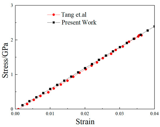 The uniaxial tensile process along the Z-axis of the single-crystal pure magnesium system is simulated to validate the simulation condition. The uniaxial stress–strain curves (Figure 2) are obtained. The slope of the elastic section (elastic modulus) is consistent with Tang’s molecular dynamics study on the tensile single-crystal pure magnesium [35]. The simulation condition is applicable for the current study.