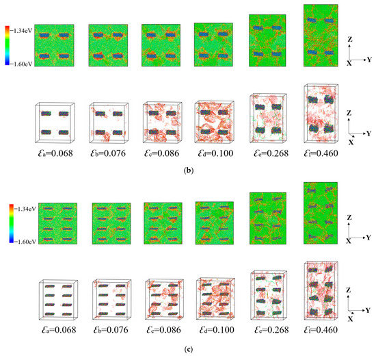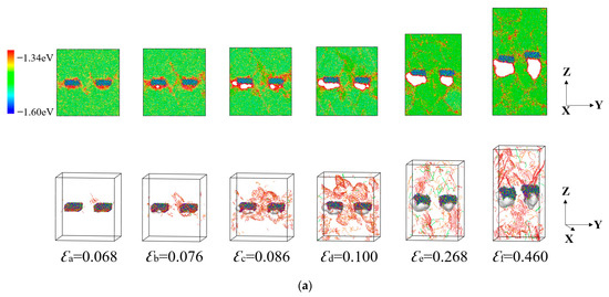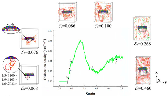 Figure 10a shows the potential energy cross sections together with the void and dislocation evolution of the system with two precipitates. Because the incoherent interfaces between the precipitates and matrix possess a higher interface energy (strain a), the atoms at the interfaces are inclined to be driven to move. Therefore, the dislocations preferentially nucleate around the precipitate (strain b), and the voids gradually grow (strain c, d). Then (strain e), the dislocation density also decreases because of the DRX. Finally, driven by the back stress due to the growth of the voids, the precipitates deflect by a small angle [39,40,41,42] (strain f).