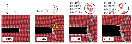 A predefined void model is established by removing the precipitate from the system with a precipitate Mg17Al12. Figure 6 displays four snapshots of the void growth in the void system. In the beginning (strain 0.006), the predefined void does not apparently deform and no slip exists. Then (strain 0.046), the dislocations with the Burgers vectors 1/9<01> nucleate along <102> direction near the tip of the void. With increasing strain (strain 0.050), in addition to the dilatation along the tensile direction, the dislocations with the Burgers vectors 1/3<100>, 1/6<20>, 1/9<023>, and 1/9<01> are emitted from the tip, and therefore, the void starts to grow. As the strain reaches 0.118, more dislocations with the Burgers vectors 1/9<20> are emitted, significantly extending the void. The damage process of the void system does not include the atomic disorder and void nucleation stages, which is different from the single-crystal system with a precipitate.