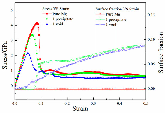 The ultimate stresses and the growth of the void of the systems with a single precipitate, a single void, and no defects are compared in Figure 7. Since the void itself is introduced as a defect, the ultimate stress is naturally the lowest. Moreover, the void, without the atomic disorder and the void nucleation stages, clearly grows faster. Due to the high energy at the interface between the precipitate and matrix, the void easily nucleates at the interface, and the plasticity of the system with a single precipitate is worse than that of the pure magnesium system. The ultimate stress of the precipitate system is slightly lower than that of the pure magnesium system, which is not contradictory to the precipitate strengthening mechanism in the systems with multiple defects. To the authors’ best knowledge, the ultimate stress in the single-crystal pure magnesium system with no defects is close to the theoretical value, and it is naturally higher than that of the system with a precipitate.