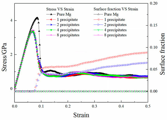 Stress vs. strain and the surface fraction vs. strain relationships of the single-crystal pure magnesium system and the precipitate systems with different dimensions and spacings are shown in Figure 9. The ultimate stresses of the precipitate systems are lower than that of the single-crystal pure magnesium system. There is no significant difference in the ultimate stress of the precipitate system. However, the free surface fractions of the system with a precipitate grows faster than that of the system with 2 precipitates. With the refinement and densification, the systems with 4 and 8 precipitates have no free surface, which indicates that no voids are formed. The specific microstructure evolution of these systems is clarified as follows.