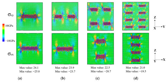 Contours of stress components at strain 0.068 (the top is σzy, the bottom is σzx) (a) 1 precipitate; (b) 2 precipitates; (c) 4 precipitates; (d) 8 precipitates.