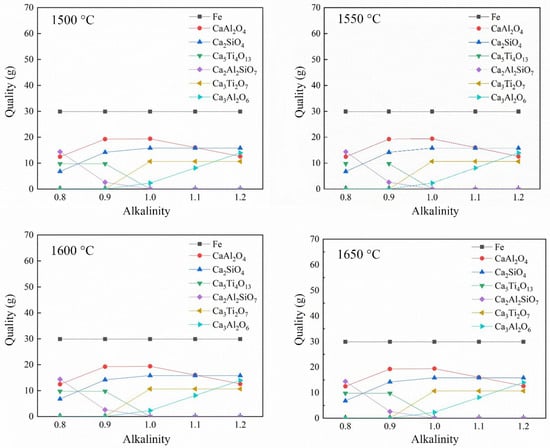Figure 3 shows the simulated composition of the products of high-iron red mud calcified slag at different alkalinities in the Equilib Module of FactSage. With increasing temperature, the phase equilibrium of the reactants showed no obvious change. With the increase in basicity (the amount of CaO added), the relative content of SiO2 will decrease, the amount of C2AS phase in the slag will gradually decrease, and the content of tricalcium aluminate (3CaO·Al2O3, C3A) will gradually increase. In the simulated phase equilibrium results, the iron obtained by reduction does not change with the change in temperature or alkalinity.