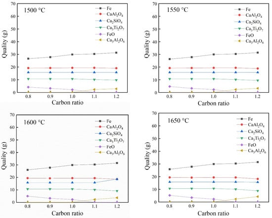 Figure 4 shows the simulated composition of the products of Factsage’s Equilib plate simulation of high-iron red mud calcified slag at different carbon ratios. With an increase in the carbon ratio, the reduction reaction proceeded in a favourable direction, and with further increases in the carbon ratio, the quality of the reduced iron increased continuously, so the carbon ratio was the limiting factor in the reaction process.