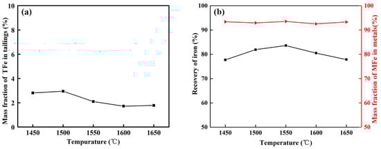 Effect of reduction temperature on (a) TFe mass fraction in calcified iron extraction tailings and (b) iron recovery and mass fraction of MFe in metal.