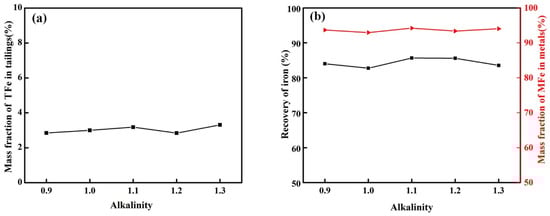 Effect of alkalinity on (a) TFe mass fraction in calcified iron extraction tailings and (b) iron recovery and mass fraction of MFe in metal.
