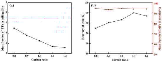 Effect of the carbon ratio on (a) TFe mass fraction in calcified iron extraction tailings and (b) iron recovery and mass fraction of MFe in metal.