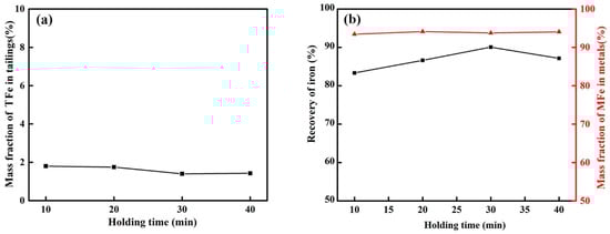 Influence of the holding time on (a) TFe mass fraction in calcified iron extraction tailings and (b) iron recovery and mass fraction of MFe in metal.