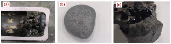 Photographs of metal and tailings after reduction of the optimal group. (a)—slag-gold interface section (b)—metal (c)—calcified iron extraction tailings.