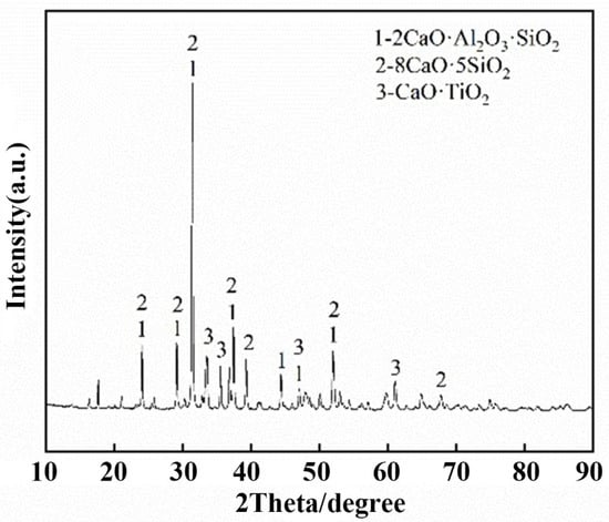 Figure 11 shows the XRD analysis of the optimal calcified iron extraction tailings. The main mineral phases in the tailings were anorthite (2CaO·Al2O3·SiO2), calcium silicate (8CaO·5SiO2) and titanopyroxene (CaO·TiO2).