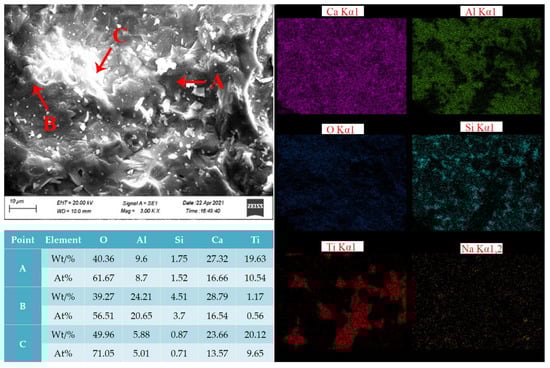 Figure 12 shows the SEM morphology and the distribution map of metal elements of the calcified iron extraction tailings obtained by the reduction of the best group of calcified iron extracted from high-iron red mud. Ca and O elements are densely dispersed in the whole plane, and the area where Al and Si are highly coincident contains a large number of irregular crystallized C2AS particles. The distribution of Ti and Al is cross-complementary, and the area of Ti aggregation distribution is the area of CT massive crystallization. The content of Na is low, and it is uniformly distributed throughout the tailings. The crystalline phases of point a are C2AS and CT, point B is C2AS and point C is CT. In SEM, the dark part is C2AS, and the bright part is CT.