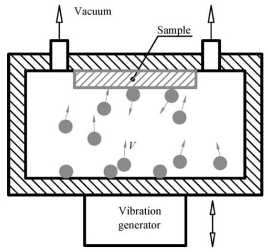 SMAT is a relatively new cold working process derived from the conventional shot peening treatment. In a basic SMAT setup (reference Figure 2), the workpiece being treated is secured in a closed chamber containing shots. The shots for the SMAT process are usually a few millimeters in diameter, which is much larger than the common shots used in shot peening. A vibration generator located at the bottom of the chamber propels the shots to impact the workpiece randomly from different angles. The vibration generator can operate between 50 Hz and 20 kHz [16]; the treatment process is also known as ultrasonic shot peening (USSP) when the vibration frequency is above 16 kHz. Furthermore, the generator power and treatment duration are also adjusted as required for the desired results. Similar to shot peening, the surface material of the workpiece becomes plastically deformed due to the repetitive shot impacts. The plastic deformation leads to changes in the microstructure and mechanical properties of the surface region of the material. A gradient structure with a nanosized grain layer on the material surface can be formed. Additionally, the surface roughness of the workpieces will increase after the SMAT treatment, and surface defects can be induced if the treatment is severe [5].
