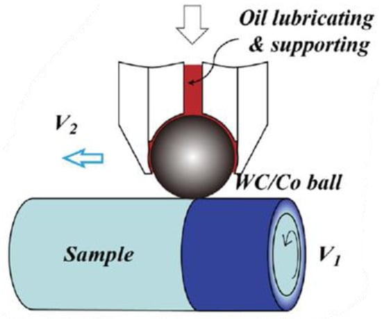 SMRT and DR are the same surface rolling treatment method. Common materials that can be processed with surface rolling treatments are titanium alloy, carbon steel, stainless steel, and aluminum alloy. The tests are typically performed using cylindrical or flat hourglass-shaped workpieces. There are different ways to perform a surface rolling treatment depending on the material type and geometry. For treating a cylindrical hourglass-shaped workpiece, one common surface rolling method involves pressing and rolling a single polished tungsten carbide (WC/Co) ball over the targeted surfaces while the workpiece is rotating (reference Figure 3). Delgado et al. [18] also described a similar surface rolling setup using a surface rolling machine, where three balls spaced 120° apart—instead of one ball—were used to treat the hourglass specimen surfaces. Saalfeld et al. [19] used another type of surface rolling tool to treat test specimens and added an induction heater to heat the specimens while performing the rolling process. Oevermann et al. [20] used the same surface rolling tool as Saalfeld et al. [19] but applied liquid nitrogen to maintain cryogenic conditions while treating test specimens. For non-symmetrical workpieces, the material can still be treated with surface rolling by using a moveable ball or roller to press against the treated surface [21].