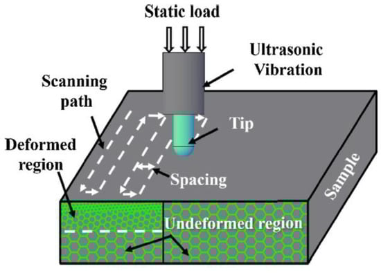 UNSM treatment (also known as UIT) is an advanced surface treatment method that is effective in improving material fatigue properties. During the UNSM process, a semi-spherical tooltip (usually made from tungsten carbide) is pressed against the target surface by a static load. Additionally, a vibration generator drives the tooltip up and down at an ultrasonic frequency, such that the tooltip continuously strikes the material surface as it scans through the targeted area (reference Figure 4) [23,24]. Therefore, this method is also commonly referred to as ultrasonic peening treatment or ultrasonic impact treatment. The combined static load and peening impact force from the tooltip causes significant plastic deformation to the material surface and induces compressive residual stress. The plastic deformation also produces a gradient microstructure with a nanograin surface layer and changes the mechanical properties of the material in the deformed region. Moreover, the UNSM treatment can also improve the material surface roughness and reduce surface defects [23]. Common control parameters for the process include ultrasonic amplitude, static load, scanning spacing, and scanning speed.