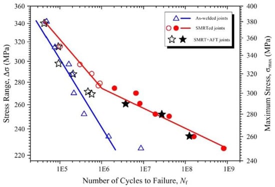 Comparison of fatigue test data (axial load, R = 0.1) of FSW 7075-T651 aluminum specimens with as-welded, SMRTed, and SMRT + AFT conditions. The SMRT + AFT condition indicates that specimens had an additional microgroove added after processing with SMRT to simulate the surface condition of as-welded specimens. The open symbols represent the surface crack failures and the solid symbols represent the interior crack failures. Reprinted with permission from Ref. [1]. Copyright 2019 Elsevier.