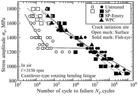 Comparison of rotary bending fatigue test results for different batches of JIS SUJ2 specimens. The specimens treated with 500 µm shot peening are marked as SP, and specimens treated with 55 µm fine particle shot peening (also known as the WPC treatment) are marked as WPC. The SP-Emery specimens were fabricated by post-polishing SP specimens. Reprinted with permission from Ref. [10]. Copyright 2002 Wiley.