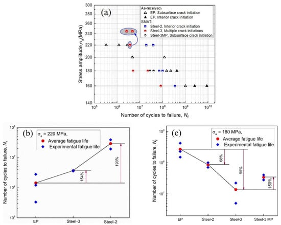 The rotary bending fatigue test results reported by Sakai et al. [4] showed that surface rolling treatments improved the high-cycle and very-high-cycle fatigue properties of JIS SUJ2 steel specimens, and the improvement was greater in the HCF regime. Additionally, internal crack failures occurred at significantly higher fatigue stress levels on rolling-treated specimens compared to untreated specimens at a load cycle Nf = 107. In the study by Saalfeld et al. [19], the fatigue test results showed that SMRT significantly improved the fatigue properties of SAE 1045 steel specimens in the HCF and VHCF regimes in a uniaxial fatigue test. The research from Dong et al. [1] indicated that SMRT had strong positive effects on axial-load fatigue properties of friction-stir welded (FSW) 7075-T651 aluminum specimens in HCF and VHCF regimes. The failure mode in the VHCF regime also shifted from surface crack failures to interior crack failures after SMRT (reference Figure 5).