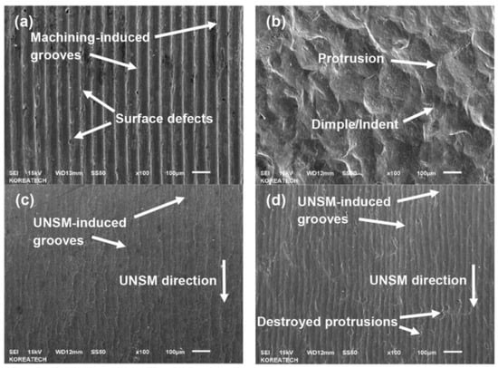 Scanning electron microscopy (SEM) images of the surface conditions of AISI 4340 specimens in (a) as-received condition and after (b) SP, (c) UNSM, and (d) SP + UNSM treatments. Reprinted with permission from Ref. [28]. Copyright 2020 Elsevier.