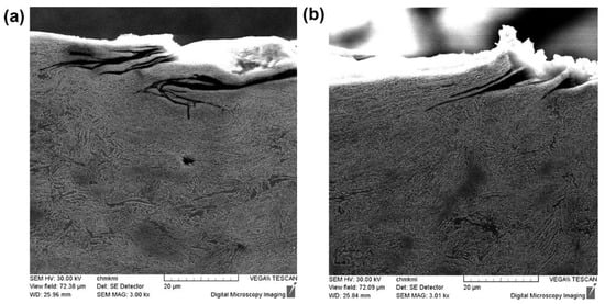 Rather than improving surface conditions, the surface roughness of a metal generally increases after shot peening and SMAT treatments. The impacts of the shots during SP and SMAT treatments can create dimples that roughen metal surfaces, and the coarse surface condition negatively affects the fatigue properties of the metals. For instance, Gao et al. [5] polished two specimens in a batch of four SMAT-treated 7075-T6 aluminum specimens and subjected them to ultrasonic fatigue tests. At a fatigue stress amplitude of 180 MPa, the polished specimens (Steel-3MP) had on average a 150% longer fatigue life (reference Figure 7c). In addition to increasing surface roughness, surface defects can be induced by SP and SMAT treatments. In the research by Trško et al. [12], severe plastic deformation was observed in the surface region of severe shot peening-treated 50CrMo4 steel specimens. This severe plastic deformation induced sharp notches and peeling on the surface of the specimens, as shown in Figure 9. Similarly, Myung et al. [29] observed that micro-pits were occasionally generated on the shot peening-treated surface of SAE 9254 specimens, but not on the untreated surface. The defects noted above were detrimental to the fatigue properties of the treated materials. They served as stress concentration areas and promoted surface crack initiation. In summary, the SP and SMAT processes are detrimental to the surface finish of metals; thus, it is important to control the treatment intensities to minimize the negative impact on fatigue properties.