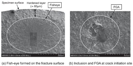 SEM observations of the fracture surface of the interior inclusion-induced fracture from rolling-treated JIS SUJ2 specimens: (a) fisheye formed on the fracture surface; (b) inclusion and FGA at the crack initiation site. Reprinted with permission from Ref. [4]. Copyright 2015 Wiley.