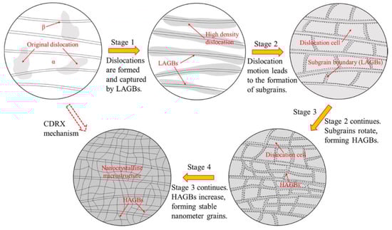 In addition to the work-hardened layer, the subsurface plastic deformation zone is another indication of the strengthened microstructure induced by surface treatments. Grain refinement is generally observed in the plastic deformation zone, and it can further induce the nanograin layer and gradient microstructure to greatly enhance the fatigue properties of treated metals. The typical nanocrystalline grain refinement process is shown in Figure 11 [7,23,28]. During the surface treatment process, the material undergoes plastic deformation due to the high strain rate and high-density dislocations occur, forming dislocation walls and dislocation entanglements. As plastic deformation continues, subgrain boundaries, dislocation cells, and/or deformation twins are gradually formed due to dislocation motions, such as gliding, interaction, accumulation, tangling, rearrangement, and annihilation. The subgrains then rotate with further increases in plastic strain and strain rates, which eventually leads to subgrain boundaries with a greater orientation and transforms low-angle grain boundaries (LAGBs) into high-angle grain boundaries (HAGBs). As the subgrain and HAGBs continue to form, the grain size is then gradually refined down to the nanoscale. Thus, the gradient microstructure may also be induced during the surface treatment process if the plastic strain and strain rate also exhibit a gradient distribution along the depth direction [7,23,28].