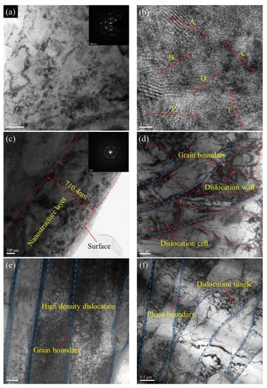 Transmission electron microscopy (TEM) morphology of the microstructure in the surface region of the LSP-treated Ti-6Al-4V titanium specimen: (a) surface nanocrystals; (b) high-resolution image of (a) showing different nanocrystal orientation; (c) nanocrystal layer; (d) dislocation cells; (e) high-density dislocations; (f) low-density dislocations. Reprinted with permission from Ref. [7]. Copyright 2022 Elsevier.