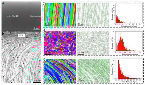 The surface morphology of SMRT-treated FSW 7075-T651 aluminum specimens: (a) surface with and without microgrooves induced by post-SMRT fine turnings; (b) cross-sectional microstructure of the gauge consisting of NGL, DGL, and CGL; (c–e) electron backscatter diffraction (EBSD) results of CGL, NGL, and DGL, respectively. Reprinted with permission from Ref. [1]. Copyright 2019 Elsevier.