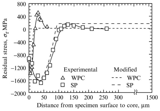 Experimental and modified results of residual stress distribution in SP-treated JIS SUJ2 steel specimens. The modified residual stress distribution shown by dashed lines reflects the stress redistribution after material surfaces were electropolished during the measurements. The specimens treated with 500 µm and 55 µm shots are noted as SP and WPC, respectively [10]. Reprinted with permission from Ref. [10]. Copyright 2002 Wiley.